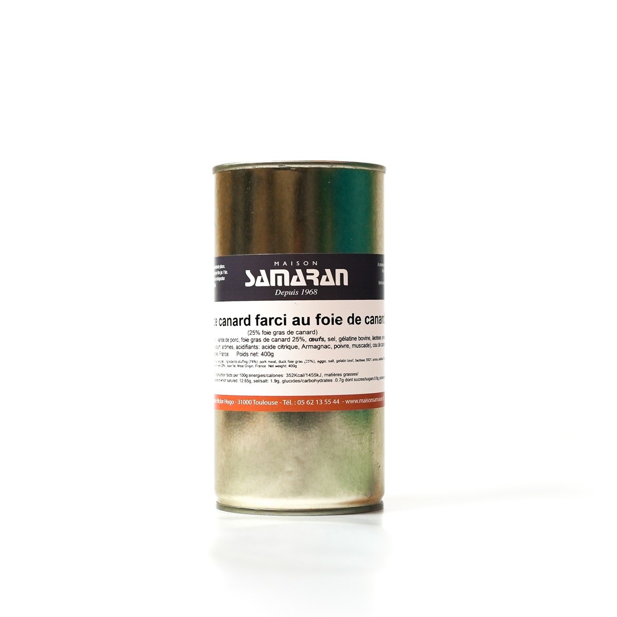 Ingrédients : Farce 74% (viande de porc, foie gras de canard (25%), œufs, sel, gélatine bovine, lactose, exhausteur de goût : glutamate de sodium, arômes, acidifiant : acide citrique, Armagnac modifié (Armagnac, sel, arôme naturel de poivre, colorant caramel), poivre, muscade, cou de canard gras (25%).