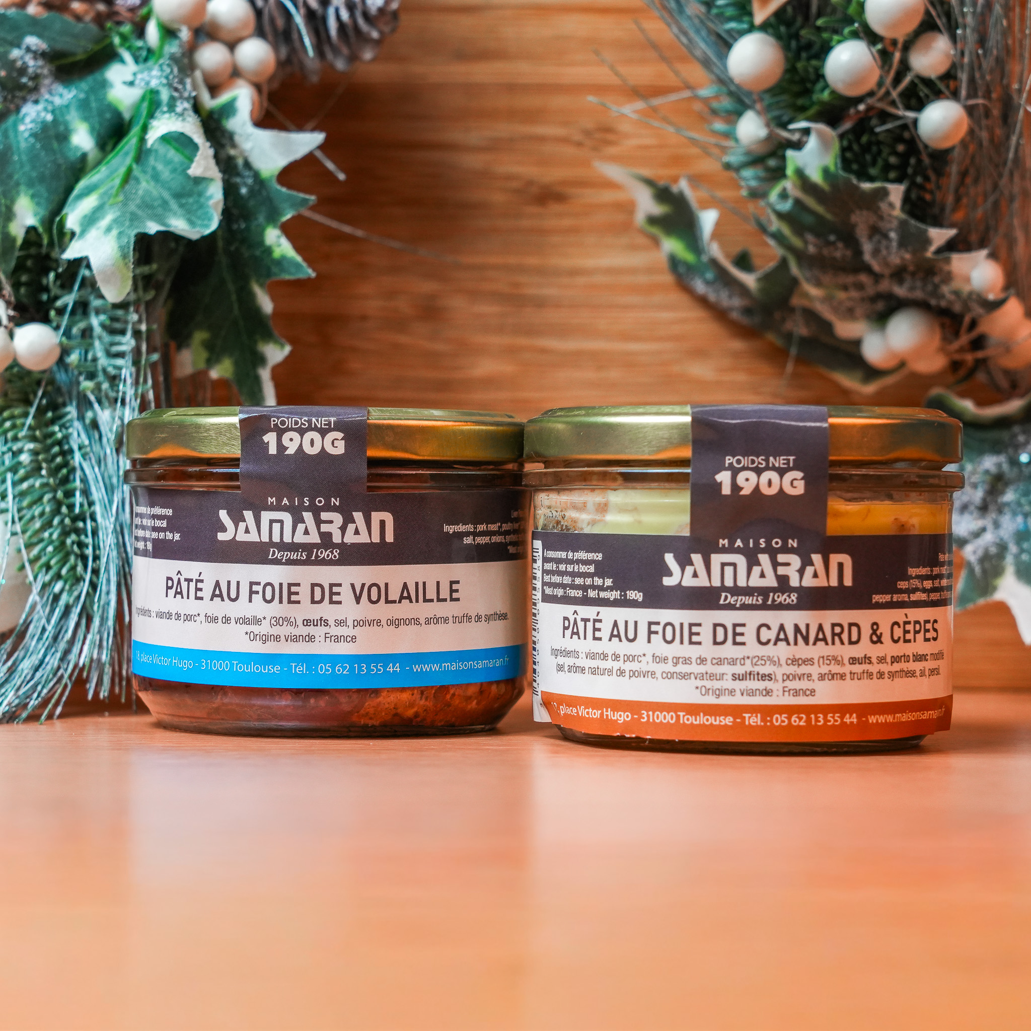 Le duo de pâtés 190gr de la Maison Samaran rassemble deux saveurs emblématiques de la gastronomie du Sud-Ouest. Élaborés dans notre atelier toulousain, ces pâtés sont préparés avec soin, patience et un savoir-faire artisanal transmis depuis 1968. Chaque ingrédient est sélectionné pour sa qualité et son authenticité, afin que le goût de la tradition se retrouve dans chaque bouchée.