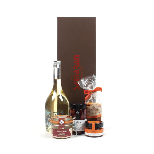 Etoile d’Égée – Coffret n°14, réunit le meilleur du Sud-Ouest et les saveurs ensoleillées de la Méditerranée. Imaginé par la Maison Samaran, il allie la finesse du foie gras d’oie entier à la fraîcheur d’un vin blanc du Languedoc, le tout accompagné de douceurs salées et sucrées à partager.
