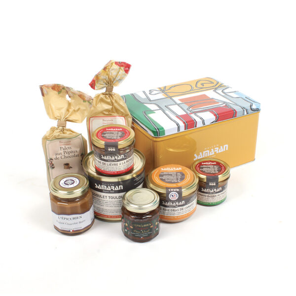 Soleil d’Hiver – Coffret n°11 réchauffe les cœurs et les papilles. Pensé par la Maison Samaran, il célèbre la convivialité et la générosité du Sud-Ouest à travers des produits artisanaux préparés avec soin dans son atelier toulousain. Présenté dans une boîte en fer jaune éclatante, ce coffret attire le regard et éveille aussitôt l’appétit.