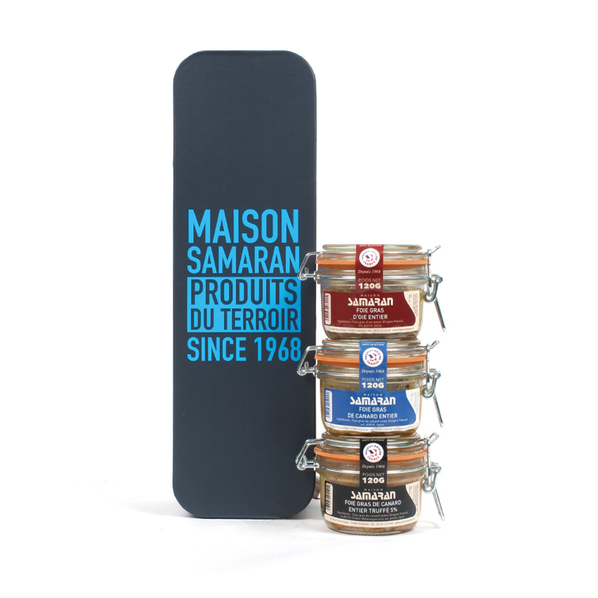 Le Coffret “Triptyque du Goût” incarne l’essence même de l’art culinaire selon la Maison Samaran. Véritable hommage au savoir-faire toulousain, il réunit trois trésors issus de nos ateliers : un foie gras d’oie entier, un foie gras de canard entier truffé 5%, et un foie gras de canard entier classique.