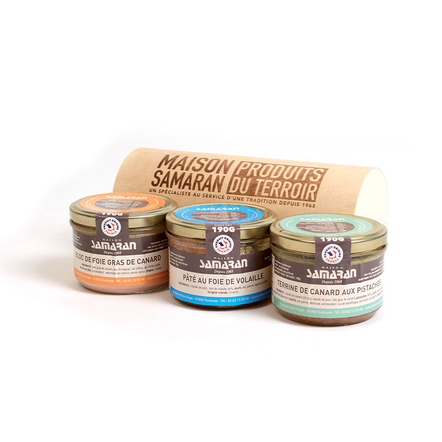 Le Trois Délices XXL – Coffret n°1 célèbre toute la richesse gastronomique du Sud-Ouest. Présenté dans une boîte en bois cylindrique grand format, il met à l’honneur les saveurs authentiques et généreuses de la Maison Samaran. Chaque spécialité est préparée dans notre atelier toulousain, à partir de canards issus de nos éleveurs partenaires. Ce coffret illustre à merveille l’exigence, le goût et la passion d’une maison familiale fondée en 1968.